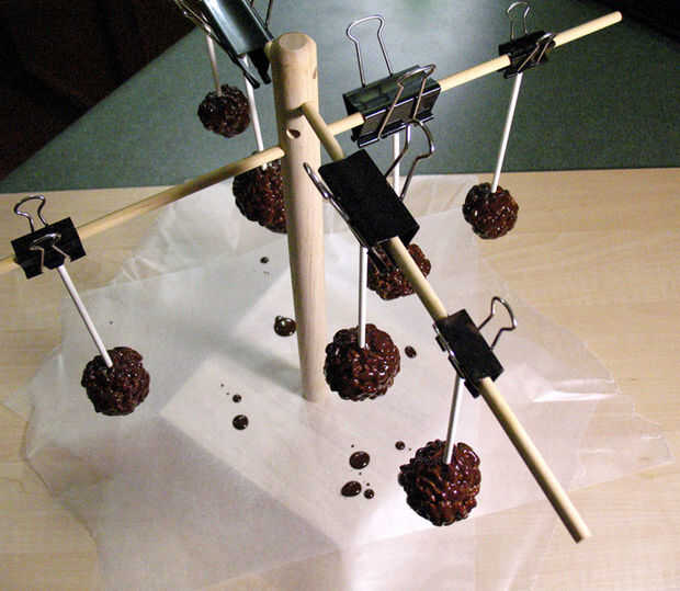 Esto se hizo para evitar el exceso de chocolate gotea hacia abajo la palanca. Si utiliza capa de caramelo en vez de chocolate real entonces creo que puedes omitir esto y coloque en la hoja de la espuma de poliestireno.