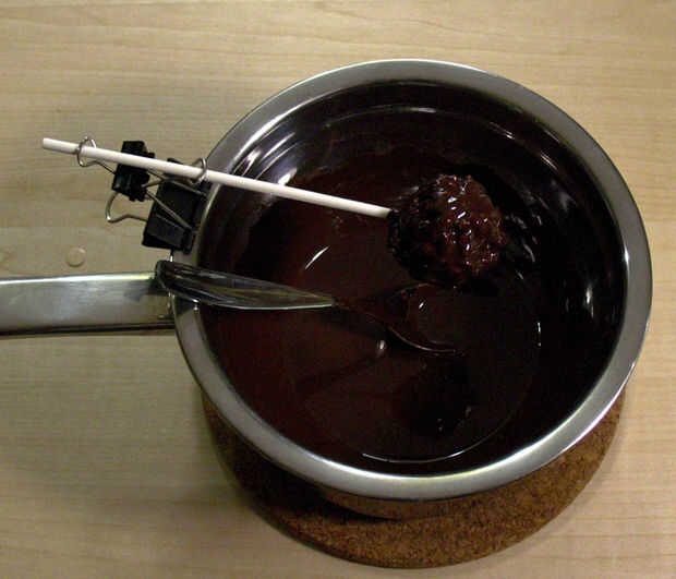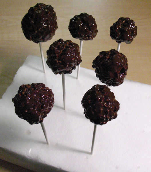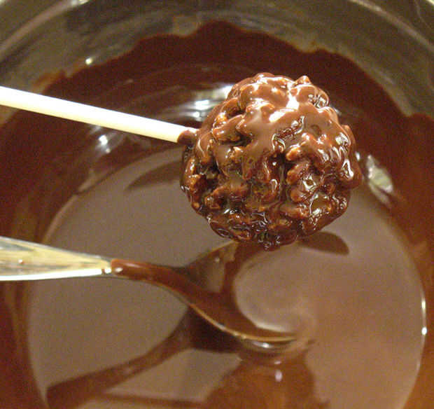 Repetí esta operación cuatro veces para cada pop por lo que tienen una capa gruesa de chocolate (me encanta el chocolate).