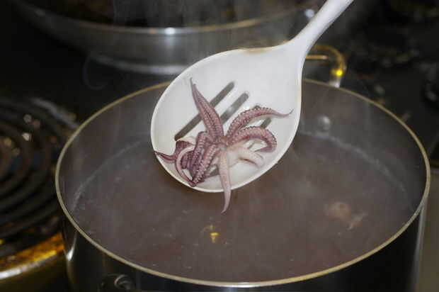 Tomé mi calamar pedacitos y les arrojó agua hirviendo durante un minuto o dos. Cocinar el calamar pero te gusta. No quiero dar demasiado sabor a calamar durante el proceso de cocción así que pensé les hirviendo sería una buena ruta. El calamar cocina muy rápido, así que como ves girando blanco y reafirmante su tiempo para llevarlos fuera del agua y dejarlos enfriar.