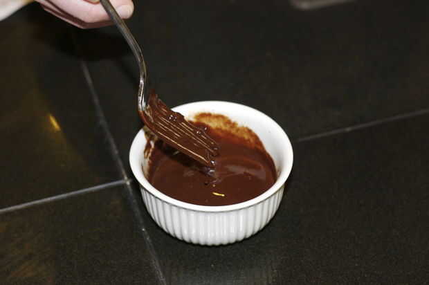 Hice mi salsa de chocolate derritiendo la mitad una barra de chocolate condimentada con Chile junto con una cucharada de mantequilla. Puede usar crema de leche aquí si lo desea, o sólo tiene que utilizar el chocolate directamente, pero encuentro que diluir con algo ayuda a fluir mejor. Chocolate más alta proporción de mantequilla dará chocolate más gruesa mientras más bajas hacen la salsa más fina. Opté por usar dos veces como mucho chocolate como mantequilla.