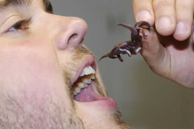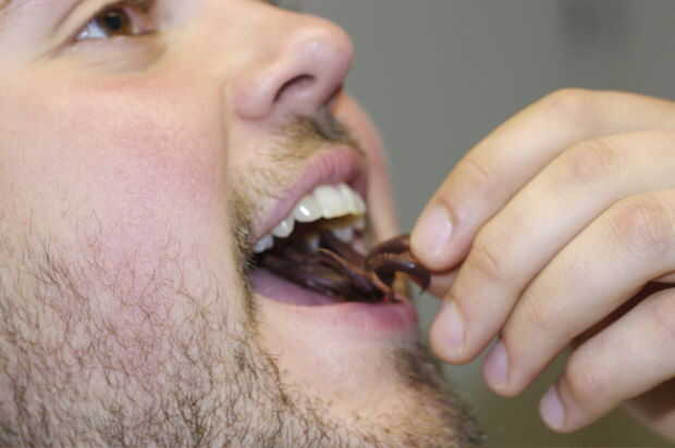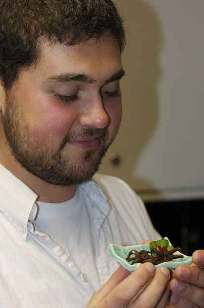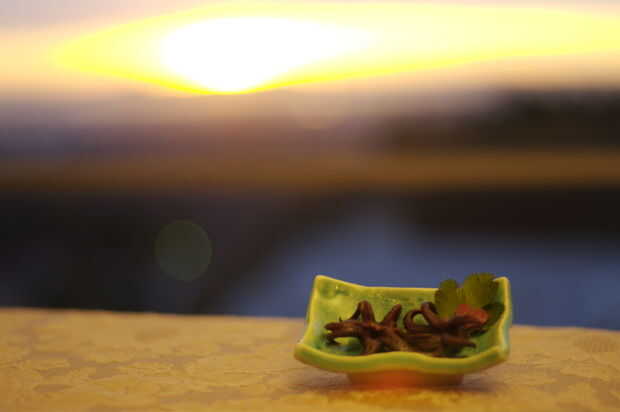 Con la salsa de chocolate templado y el calamar agradable y firme del congelador los chocolates fueron hechos más o menos. Coloqué en un plato con algunas guarniciones de día de San Valentín (muchas gracias a Canida para crear el corazón de la piel de naranja de sangre) y luego poner los chocolates en la mesa para hacerles disfrutar de las vistas de los atardeceres de la zona de la bahía.
