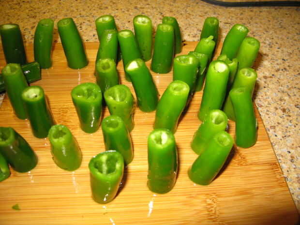 Cortar ambos extremos de cada Chile, luego cortarlos por la mitad. Esto debe darle el tamaño adecuado para "fuegos artificiales". Sacar las semillas podría parecer como una tarea, pero si tienes una paja alrededor de la casa, funciona perfectamente! basta con pulsar la paja a través de la Chile, separar las semillas de las guindillas y eliminarlos, ya que las semillas serán ahora en la paja. PRESTO!
