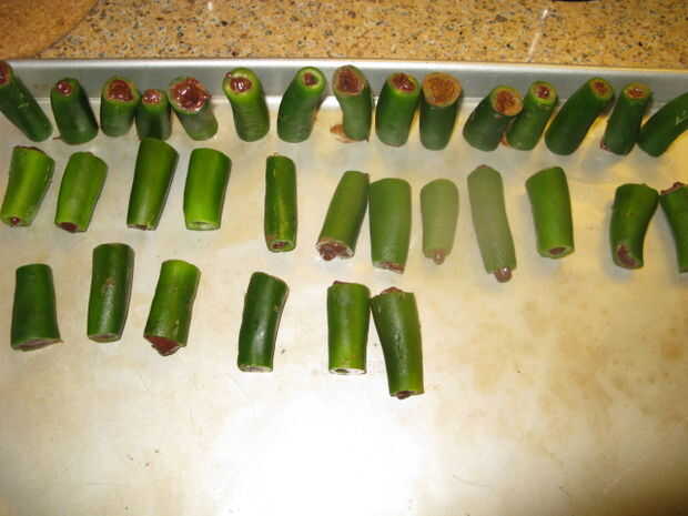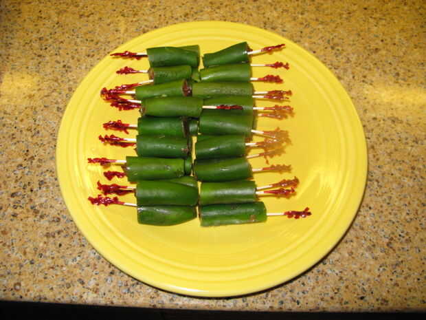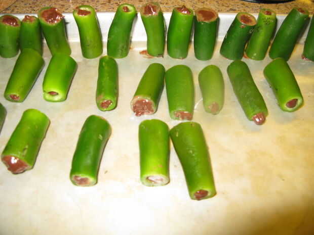 Ahora pegue el palillo de cóctel en cada Chile y conjunto en la nevera para el ganache se endurezca para que nos los podemos sumergir en el chocolate.