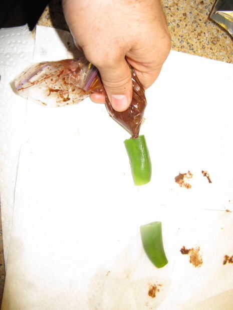 Si tienes una manga pastelera con una punta pequeña, usted puede utilizarlo, o, hacer lo que hice, corte un pequeño rincón de la esquina de una bolsa de ziplock, llenar la bolsa con la ganache, y luego exprima el agujero en la esquina en los chiles.