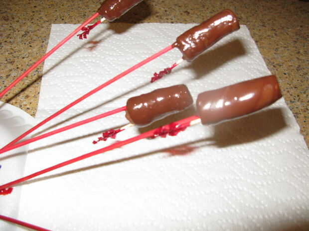 En el baño María, derretir el 16 onzas de chocolate con leche con 2 cucharadas de mesa de acortamiento. Revuelve hasta que esté todo derretido y suave. Ahora, uno por uno, inmersión los chiles en el chocolate, a palillo que coloca en él antes, cubren completa, ellos los pegan en un pedazo de espuma de poliestireno para que el chocolate puede enfriar y endurecer.
