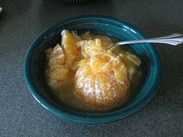 Tomar las naranjas y, con el cuchillo y tabla para cortar, cortar cada uno por la mitad para que ahora tenga 24 mitades de naranja. Luego, tomar la cuchara de metal y sacar la carne de la cáscara. Colocar la fruta de la naranja en uno de sus cuencos de tamaño mediano y reservar.