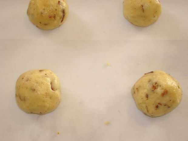 Rodillo la masa en bolas de 1 pulgada y colocar en galletas de 3 pulgadas aparte. Aplanar las bolas de masa con los dedos hasta 1/4 pulgada de espesor. hice éstos por aplanar como ellos dejando una bola de.