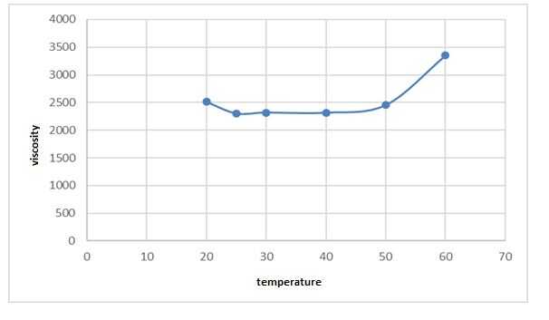 He realizado mediciones de manera que en un recipiente que mide la viscosidad se coloca chocolate a 60 ° C y se enfría a 20 ° C, después de la caída de la temperatura por cada 10 ° C tomo una nota. En el gráfico que se puede observar que después de unos 40 ° C la viscosidad empieza a aumentar exponencialmente, es más probable que forma una especie de quasicrystals peculiares para proporcionar diferentes características físicas, similares a lo que sucede con el sulfuro, cuando cruza por debajo de 20 ° C la viscosidad también comienza a aumentar como el chocolate se solidifica.