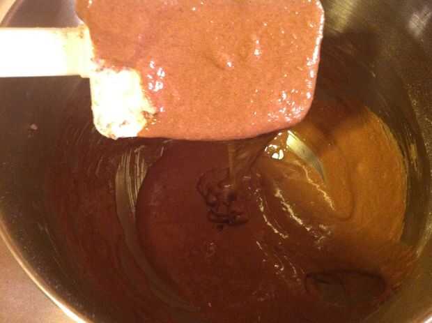 5. Después de que el merengue está formado doble cuidadosamente la mezcla de harina de almendra a la mezcla de huevo.  Quieres mantener todo el aire en el merengue como puedas.