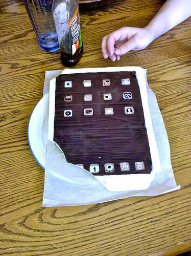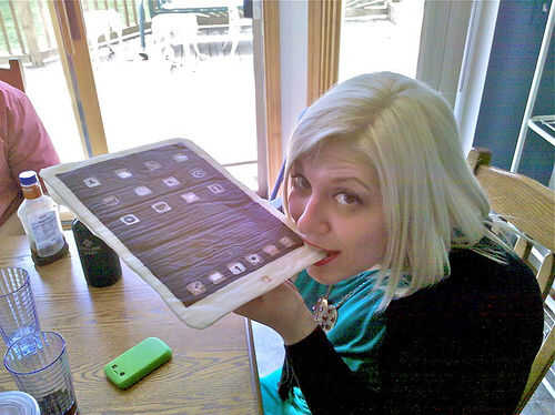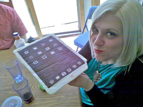 Aquí está mi hermana tomando el primer bocado de la iPad de chocolate delicioso.