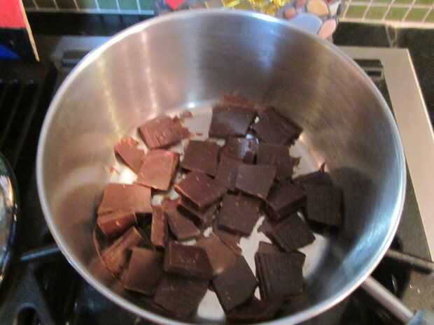 Picar el chocolate en trozos. Pon los trozos en una olla en la estufa. Poner a fuego medio y revuelva de vez en cuando. Tomar chocolate apagado quemador cuando derretido.