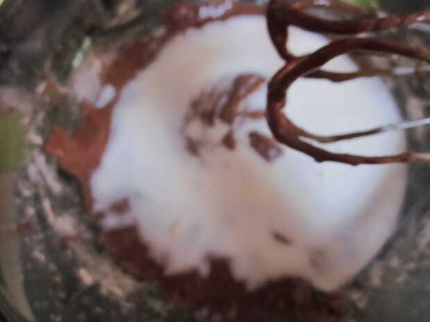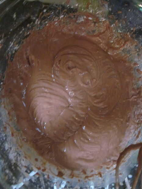 Agregar leche y harina a la mezcla húmeda y bata hasta que esté de color marrón claro, espeso y cremoso.
