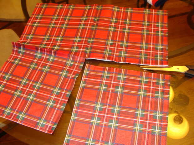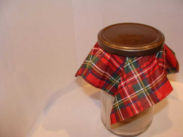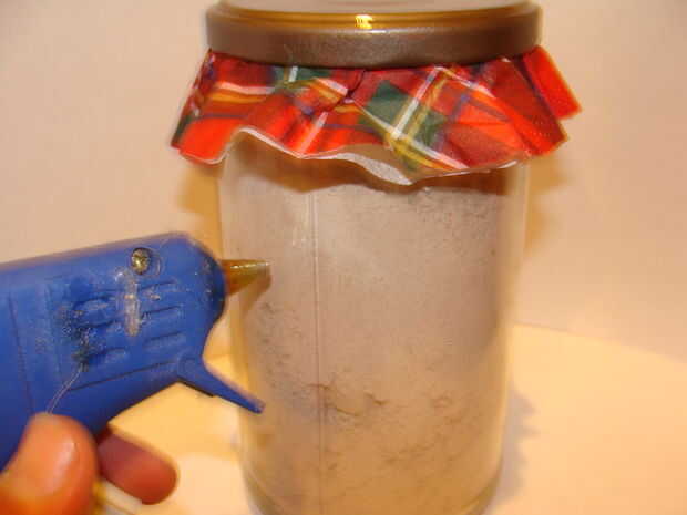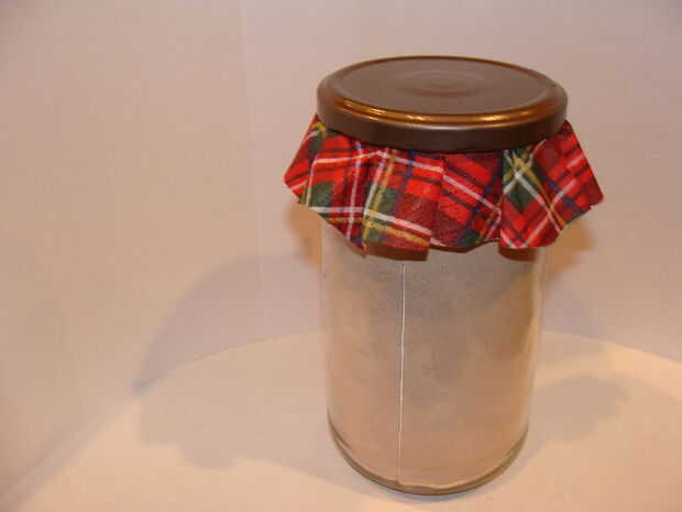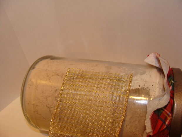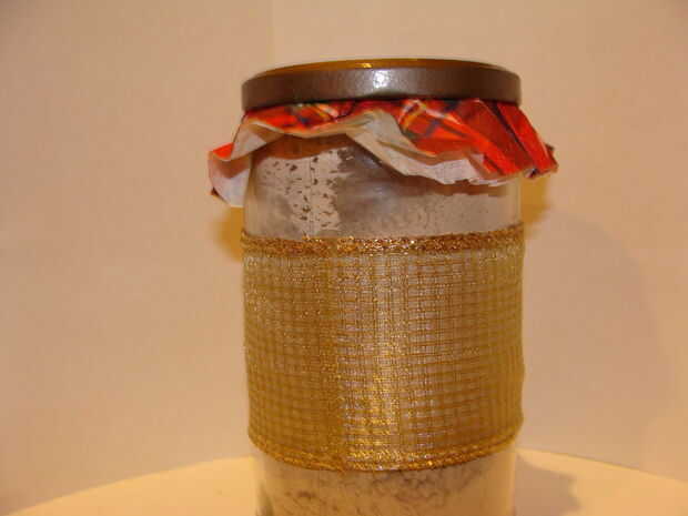 Tomó una servilleta festiva, cortar una fina parte de ella y atornillado en la tapa en la parte superior. Corte la servilleta sobrante en mi longitud deseada. Entonces, pega caliente una cinta dorada alrededor de mi tarro, envolviendo en dos veces. Buscando y aspecto más festivo, cortar alguna cinta a mi largo y ancho deseado, luego había atado en un arco alrededor de la cinta de oro.