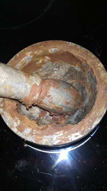 Salga de su mortero y Maja y con la espátula raspan todo el chocolate en la licuadora y ponen en el mortero y maja, también Asegúrese de obtener todo para que no pierda ningún chocolate precioso.