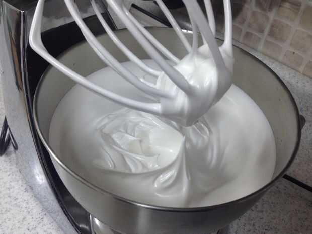 Continuar mezclando las claras de huevo hasta que se pegue a la mesa como en la foto