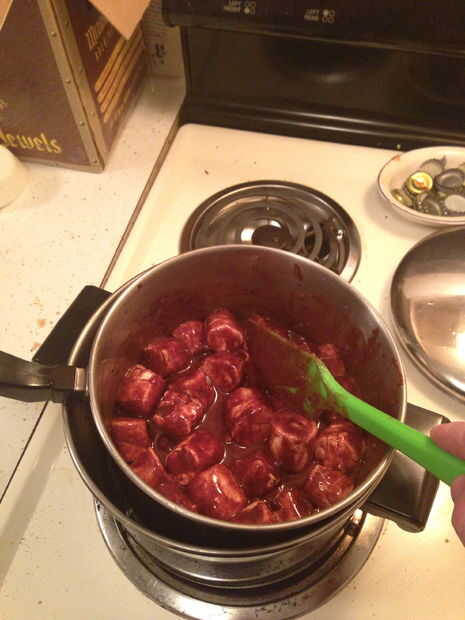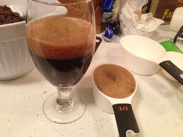 - Verter la cerveza y crema sobre el chocolate y los malvaviscos y dejar reposar durante 5 minutos. Suavemente revuelva para mezclarlos bien. Agregar la vainilla y bourbon (si usa), continuar a batir hasta que muy suave. Esto es donde terminé usando una caldera doble.