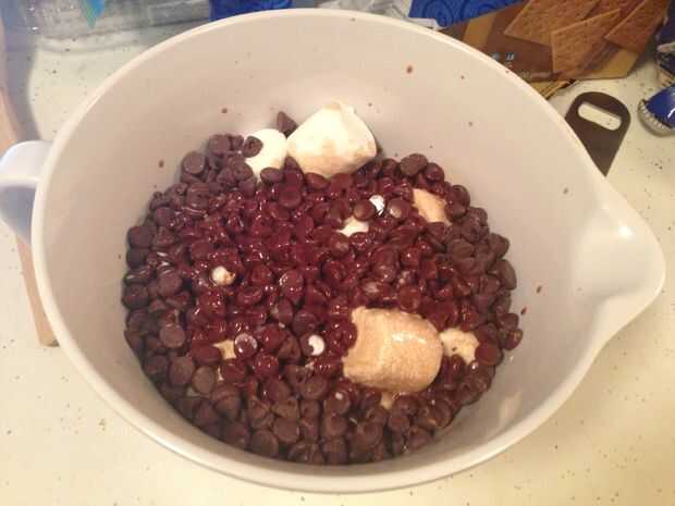- Colocar trocitos de chocolate, malvaviscos y sal en un tazón mediano.