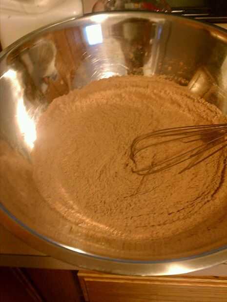 Bata la 1 1/2 tazas de harina, 1 cucharadita de bicarbonato de sodio y 1/2 taza cacao en polvo.