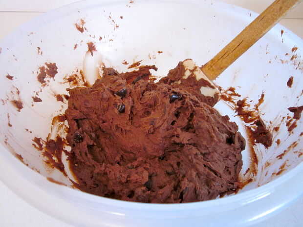 Luego mezclar los ingredientes húmedos con los ingredientes secos. Añadir los trocitos de chocolate opcionales, nueces o cerezas desecadas.