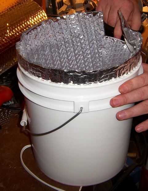 Mi cubo había inclinado lados. La parte inferior de la cubeta era cerca de 8 pulgadas de diámetro y la parte superior de la canastilla de poco más de 9 pulgadas de diámetro. Hice un montón de matemáticas para averiguar la forma correcta de cortar el aislamiento de manera que encajarán bien. Dejé el largo superior que podría cortarlo después en pegar. Mi sugerencia, elegir un cubo con lados rectos y saltarse las matemáticas. Aunque, ya que mi plato era 9 pulgadas de diámetro los lados inclinados ayudó a mantener mi tazón de fuente. Por lo tanto es una ventaja.