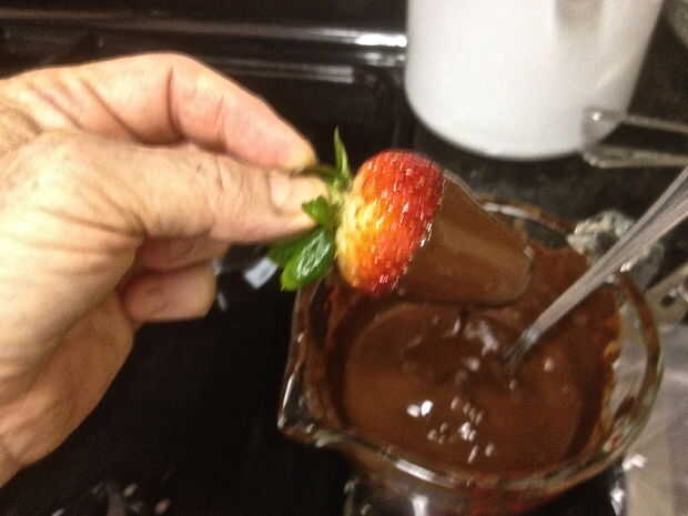 Dejando los verdes a las fresas, usar éstos para retener la fruta cuando se sumergen. Cubrir la fruta 2/3 acerca de la manera para arriba y luego dejar escurrir el chocolate sobrante antes de colocar la fruta en una bandeja para endurecer.