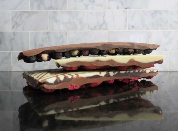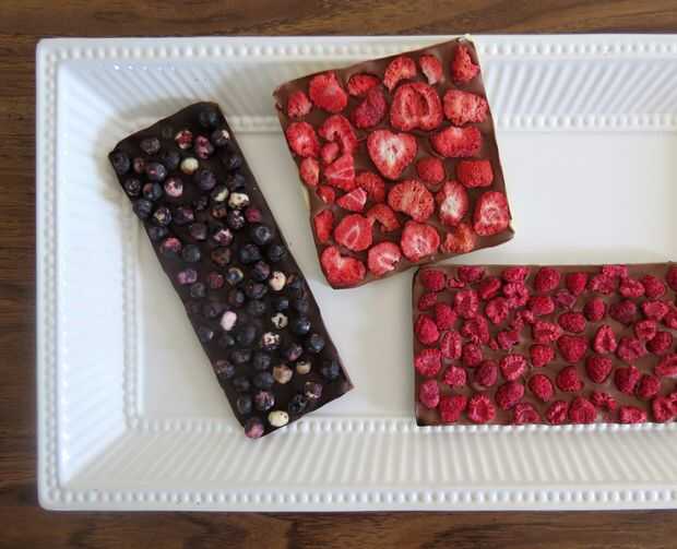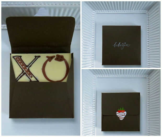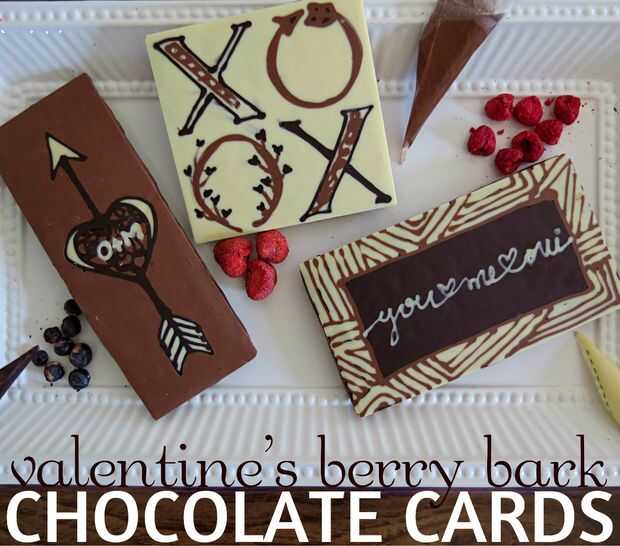 Una técnica de ilustración de chocolate simple handpiped crea las tarjetas de felicitación comestibles más personalizadas para toda ocasión durante todo el año. ¿Quién no quiere recibir un saludo de chocolate delicioso, sobre todo en San Valentín? Aún más, estas tarjetas de chocolate son corteza de chocolate lleno de luz y crujiente congelar los arándanos secos, fresas y frambuesas para el delicioso contraste.