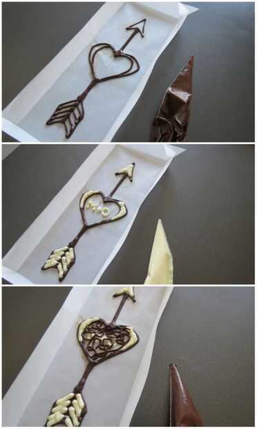 Cuando estés listo, tubo el chocolate y trazar sobre los diseños, la planificación cuidadosa su secuencia (es decir, si haces algunas capas colores en su diseño, asegúrese de comenzar con el color que se mostrará en primer plano).