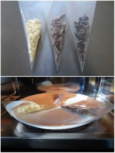 Colocar bombones en bolsas de tuberías. Microondas durante 30 segundos. Eliminar las bolsas de tuberías del microondas y masaje con cuidado el chocolate hasta consistencia uniforme. Repetición de microondas/eliminación/masaje intervalos de 30 segundos hasta que el chocolate se derrita.