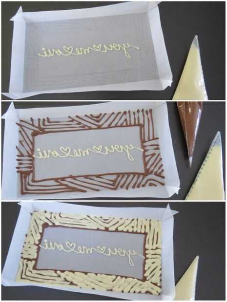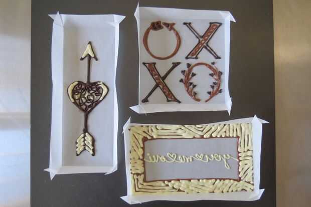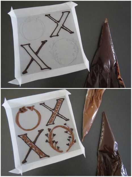 Antes de comenzar, asegúrese de probar la temperatura del chocolate en un pedazo de papel de pergamino de chatarra. Corte el extremo de la Manga pastelera, solo muy poquito. Si el chocolate está demasiado caliente, se la pipa hacia fuera rápidamente y será difícil de controlar (las líneas tenderán también a extensión/aplanar). No lo suficientemente caliente y no se bien de flujo (y resultar en líneas onduladas).