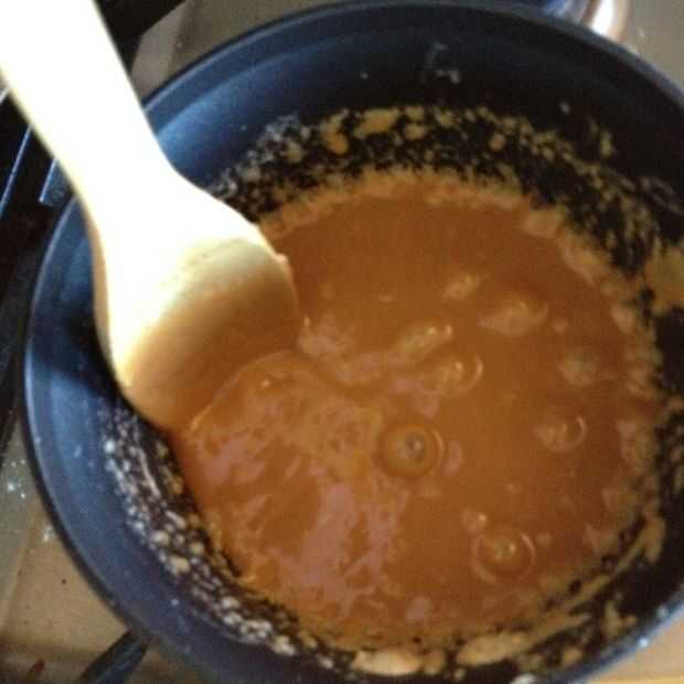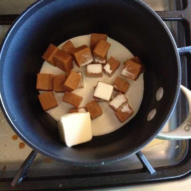 Combinar 1 taza de caramelos *, 1/4 taza de crema y mantequilla en la olla pequeña. Hierva a fuego bajo, removiendo hasta que quede suave.