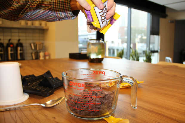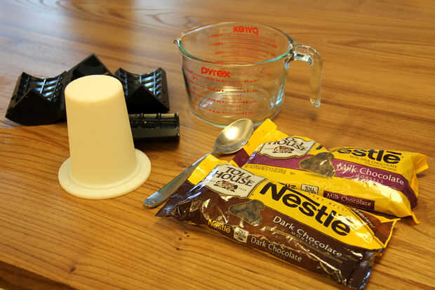 En este paso voy a mostrar lo que no se que hacer. Primero compré chips de Nestlé Toll House chocolate para derretir. Usé el microondas para calentar y remueva regularmente. I vierte directamente al molde, aprieta la parte superior y ponerlo en la nevera a enfriar. Desmoldear el chocolate fue muy doloroso y por accidente rompí unos trozos de chocolate.