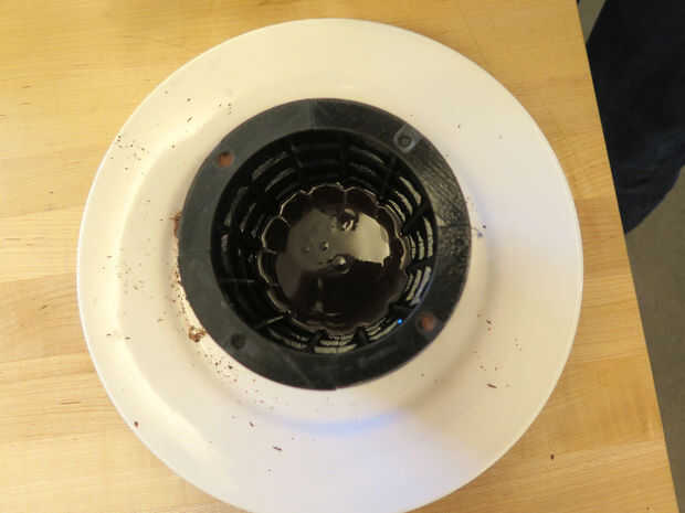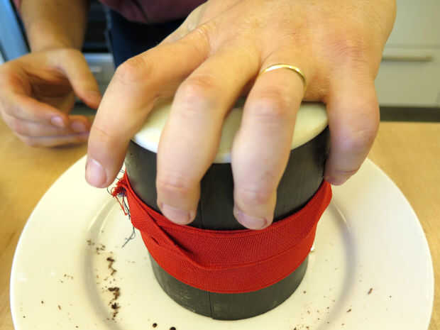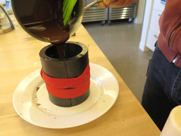 4. Agarra el émbolo y empuje hacia abajo. El chocolate derretido se apriete para arriba. Esperemos que si la cantidad de chocolate se calculó correctamente se verá algunas de chocolate que sale por el borde superior.