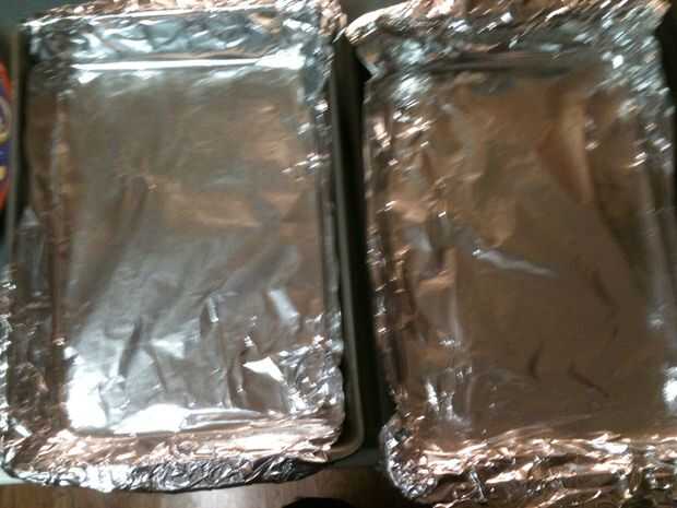 Línea dos bandejas de horno con papel de aluminio. Esto solo es opcional si quieres lavar los utensilios que han sido totalmente fracked por roca fundida azucarada.