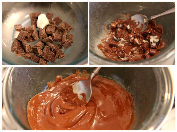 Nota: Acortamiento se incorpora en el chocolate para diluir la mezcla de chocolate derretida. Facilita las cosas en la inmersión y produce una suave capa de chocolate en el producto final. Sólo la usé con mi chocolate semidulce, no con mi chocolate blanco. No es necesario por cualquier medio, pero produce mejores resultados. MÉTODO alternativo, microondas: Si desea también puede derretir el chocolate con el microondas. Sólo tiene que colocar la manteca y el chocolate en un recipiente de microondas seguro. Calor de 30-45 segundos y luego quitar y revuelva para combinar. Seguir calentar y mezclar hasta que su chocolate y manteca se haya derretido y uniformemente mezclado.