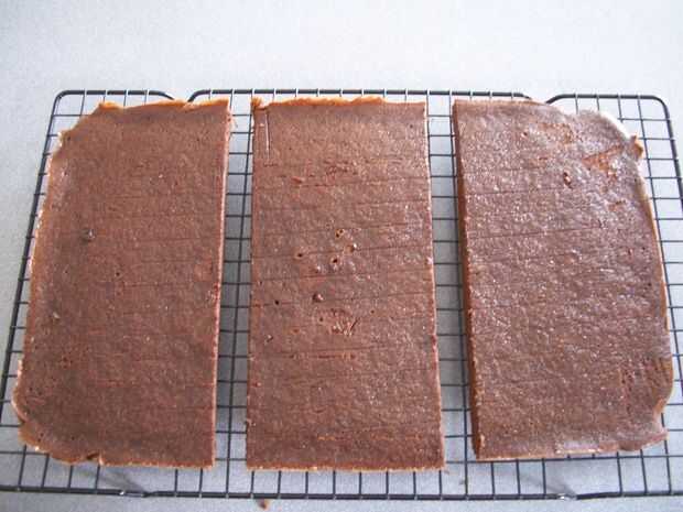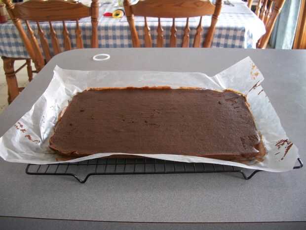 Paso 6: Invertir inmediatamente sobre una rejilla de alambre; Quite cuidadosamente el papel de cera. Invertir otra vez en otro estante de alambre para que el lado superior quede hacia arriba. Corte en 3 igual ancho tiras, aproximadamente 4 pulgadas de ancho cada uno; enfriar totalmente sobre la rejilla metálica.