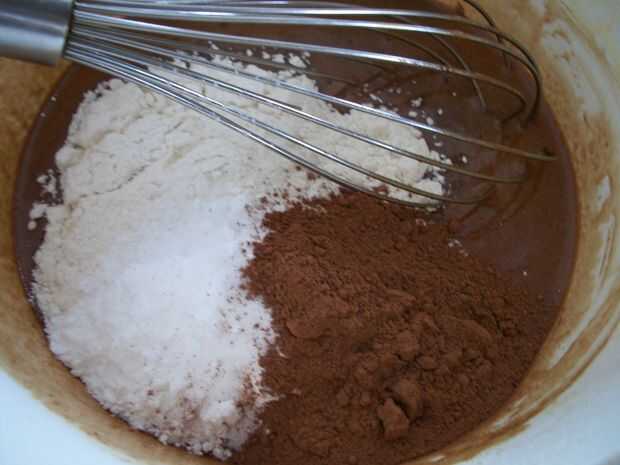 Paso 3: Batir los ingredientes secos hasta que suave y mezclado. Se trata de la harina, azúcar, cacao en polvo, polvo de hornear y la sal. Incorpore todos los ingredientes de la torta restante; que incluya la salsa de chocolate caliente, crema agria, mantequilla de maní y agua.