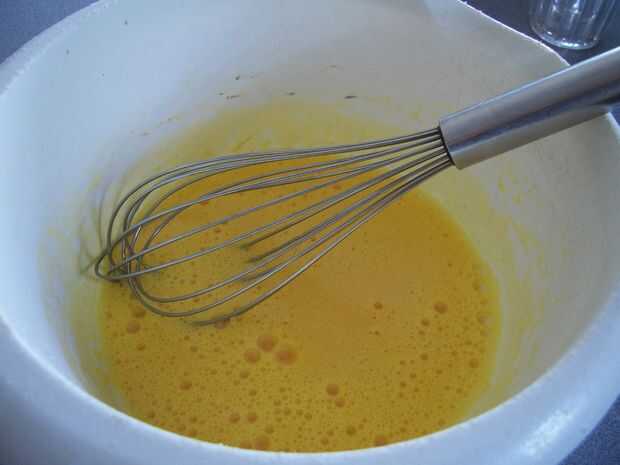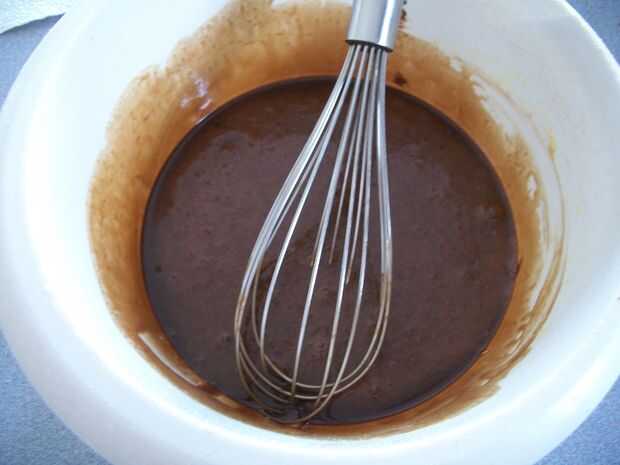 Paso 2: Mientras tanto, vigorosamente Bata los huevos en un tazón mediano con la mano hasta que ligeramente gruesa; unos 2 minutos. Incorpore el azúcar y chocolate y de mantequilla derretida hasta que quede mezclado.