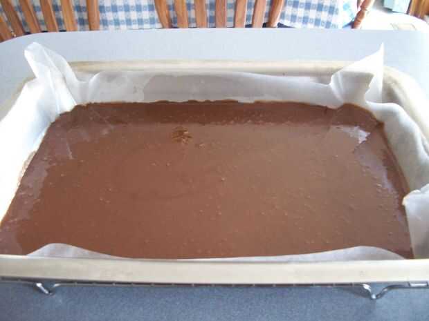 Paso 4: Una capa de 15 pulgadas por 10 pulgadas por 1 pulgada para hornear con aerosol; línea con papel de cera (basta que cuelguen de los bordes) y capa el papel con spray de cocina. Vierta la mezcla uniformemente en la bandeja.
