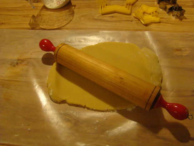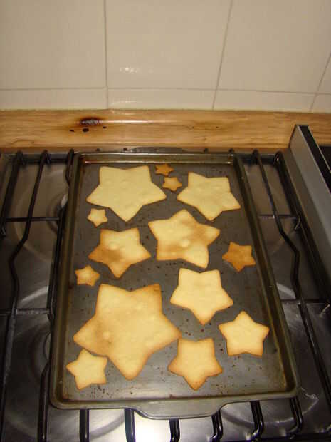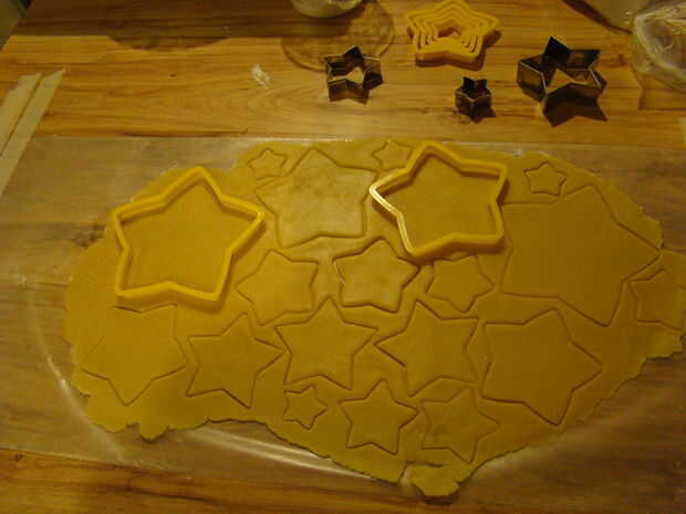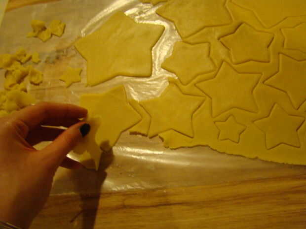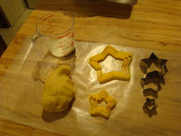 La masa, colóquela sobre el papel encerado y polvo con la harina, luego utilice el rodillo para ampliarlo y hacerlo más delgado. Cuando esté listo (no demasiado fino, como. 12'), corte (marca) las estrellas que usted considere necesario. Cuando esté listo, ser suave y sacar toda la masa sin usar. Colocar las estrellas en la bandeja del horno y ponlos en el horno. Deje que ellos cocinan 10 minutos, puede ser un poco más. Sacar las galletas del horno cuando empiecen a mirar un poco más tostado, un poco.