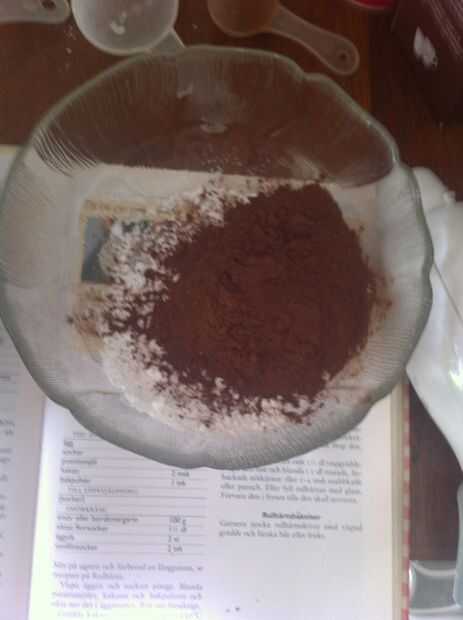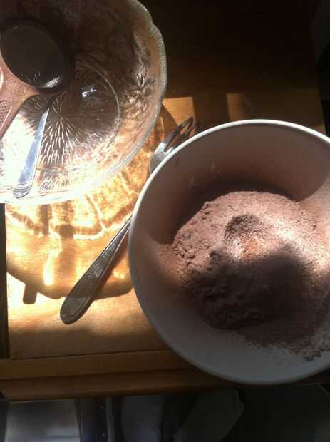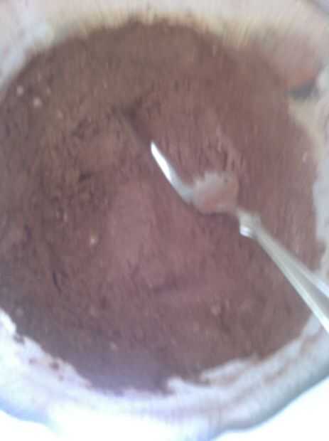 Mezcla la fécula de patata, el cacao y el polvo de hornear en un tazón separado. He acabado tamizar mina para conseguir una buena mezcla.