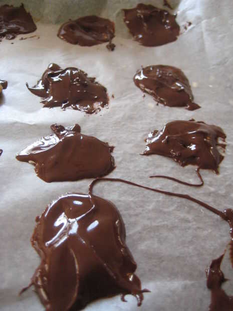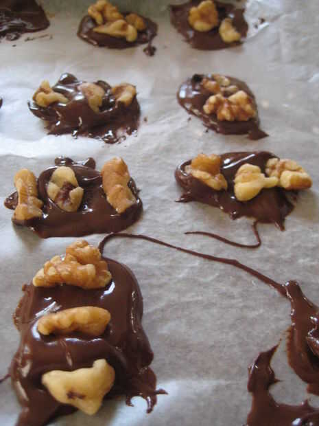 2. Coloque 3 nogal piezas sobre círculos de chocolate y asegúrese de dejar un pequeño espacio entre