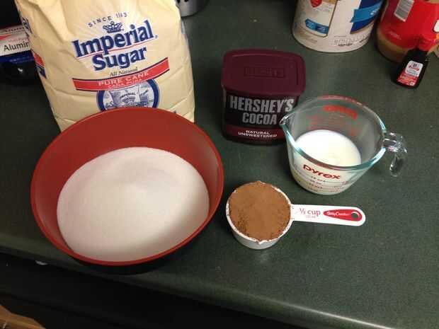 Mida 2 tazas de azúcar, 1/2 taza de cacao y 1/2 taza de leche.