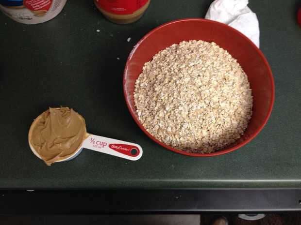 Preparar los ingredientes para el siguiente paso. En primer lugar establecen unos 2-3 pies de papel encerado sobre una superficie limpia y plana. Luego mida 3 tazas de avena y 1/2 taza de mantequilla de maní y dejar de lado la vainilla.