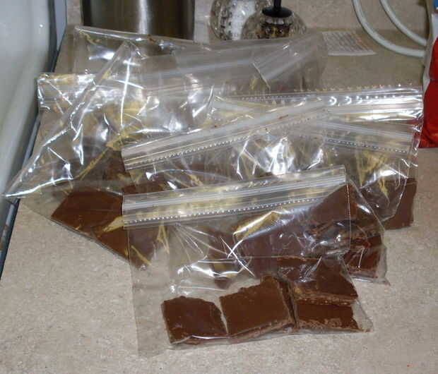 Aquí puede ver utiliza un gran cuchillo para trocear el chocolate (mientras que en el papel de cera, pero en una tabla de cortar, para no arruinar la bandeja para hornear) en trozos más pequeños y luego poner las piezas en ziploc pequeñas bolsitas para guardar en el congelador (largo plazo) o nevera (corto plazo).