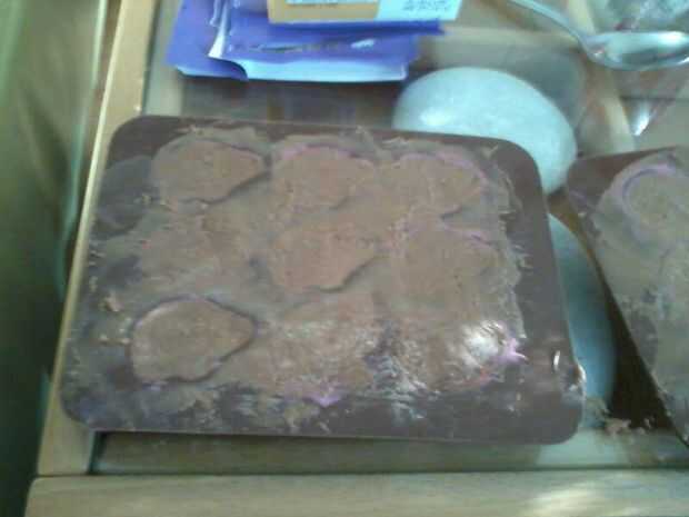 Vierta el chocolate en la parte superior del relleno. Con el dorso de un cuchillo de untar el chocolate sobre sus moldes hasta la parte posterior.