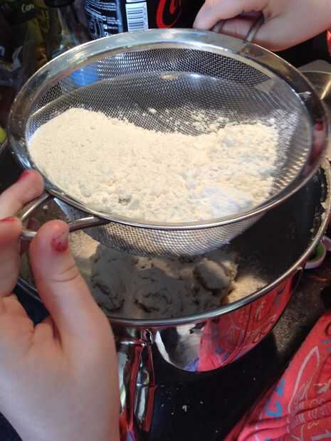 Tamizar la harina (sal y bicarb) en el mezclador y mezclar suavemente hasta que la harina se incorpora.