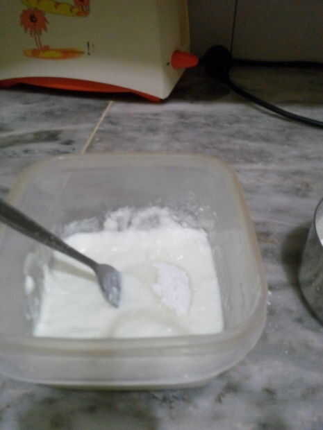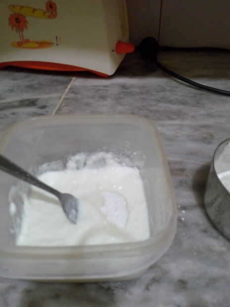 Usted tendrá que empezar la noche antes. En un bol tomar el yogurt, azúcar, polvo para hornear y para todo uso de la harina. Mezclar bien todos los 4 ingredientes.