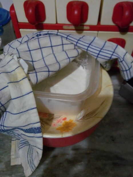 Cubra el tazón con un paño o tapa y ponerlo a un lado en un lugar cálido durante la noche o por 8 horas permitir la fermentación natural se realice.