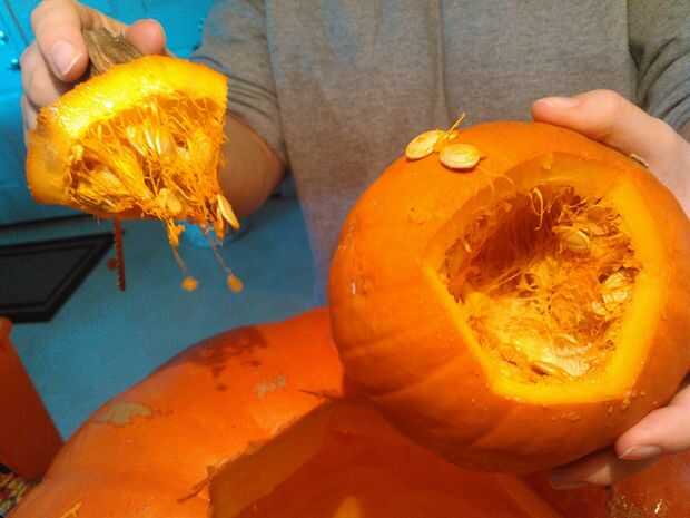 Ahora necesita corte la calabaza pequeña. Éste no tiene un agujero muy grande, lo suficiente como para conseguir un raspador interior para limpiarlo.