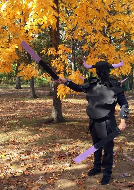 LED store-bought "velas" para los ojos (dentro de 2 capas de tela de Gasa semi transparente. Pintado balsa espadas de madera. Todo lo demás es pintado artesanal espuma con algún alambre piezas suspensión de apoyo (para guardar la armadura de derrumbarse o mantener piezas dobladas.